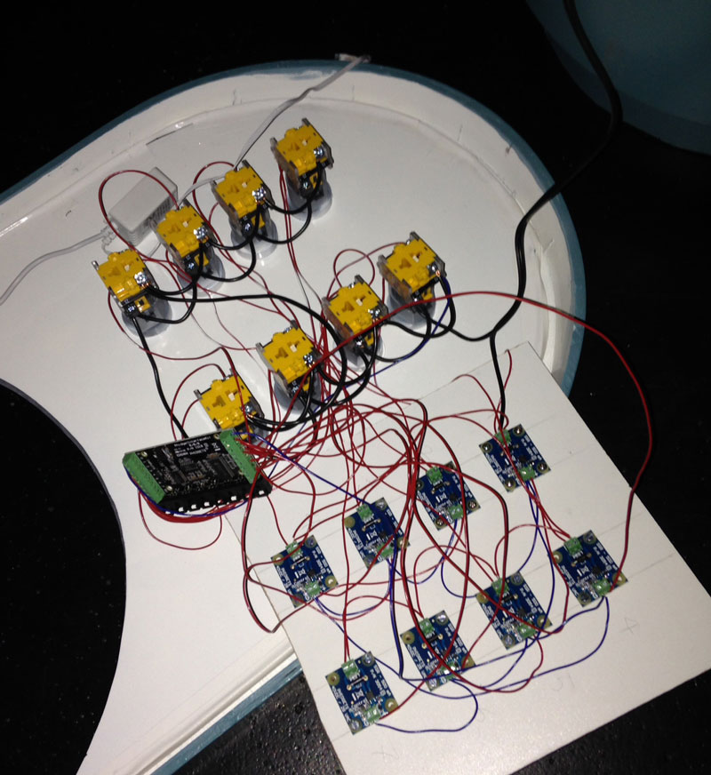 Slik ser konsollet ut fra innsiden. De gule knappene øverst, den svarte ledningen til høyre fører strøm og de blå kretskortene nederst er reléer som slår av og på strøm til lys i knappene. En datamaskin styrer det hele, men er ikke vist her
