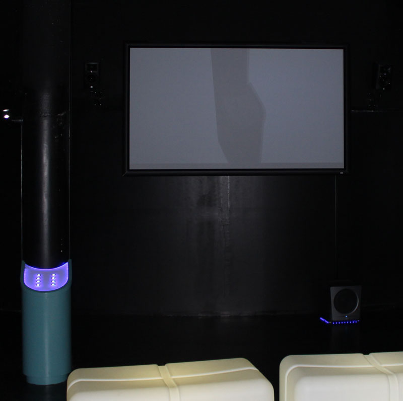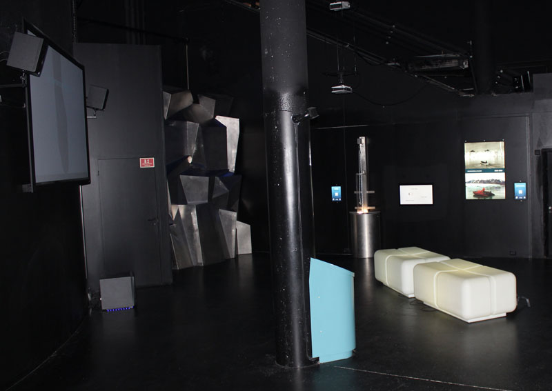 Konsoll hvor en velger filmer vist på storskjerm. Utstillingen inneholder også en touchskjerm med informasjon om iskjerner og hvilken informasjon en kan få ut av dem